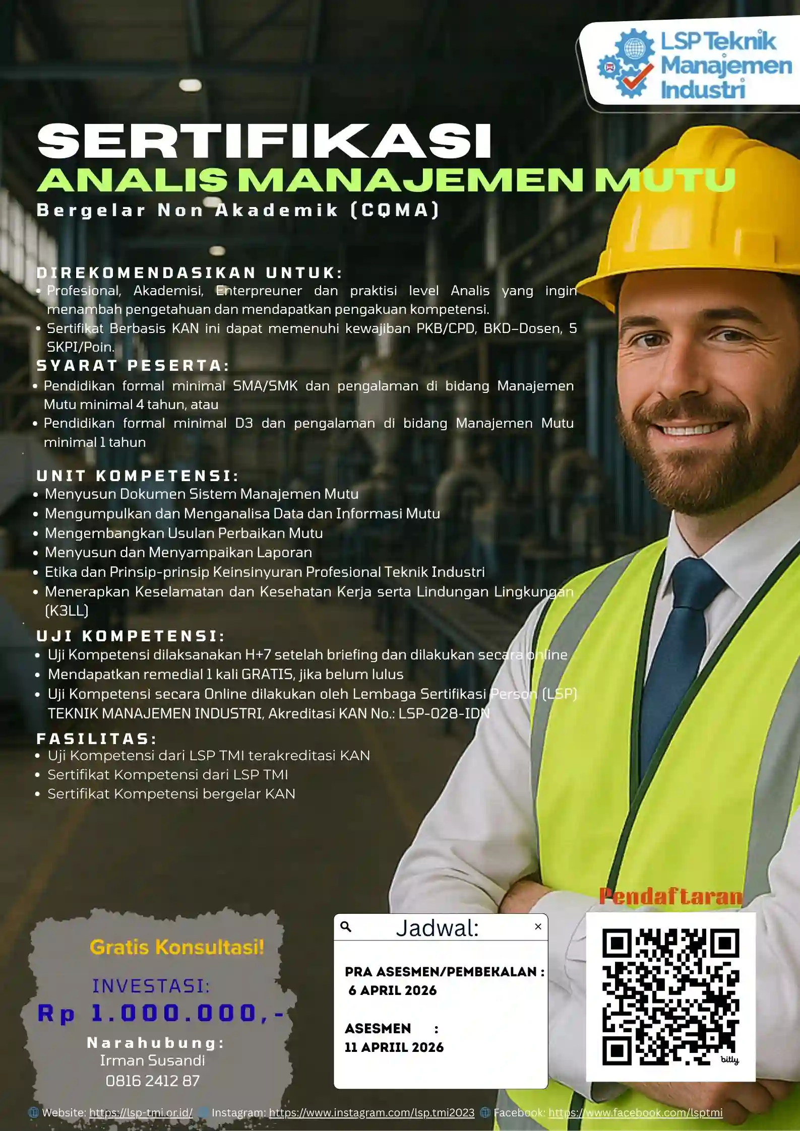 Sertifikat berbasis KAN ini menjadi bukti kredibilitas Anda sebagai Analis Manajemen Mutu yang profesional dan terpercaya.