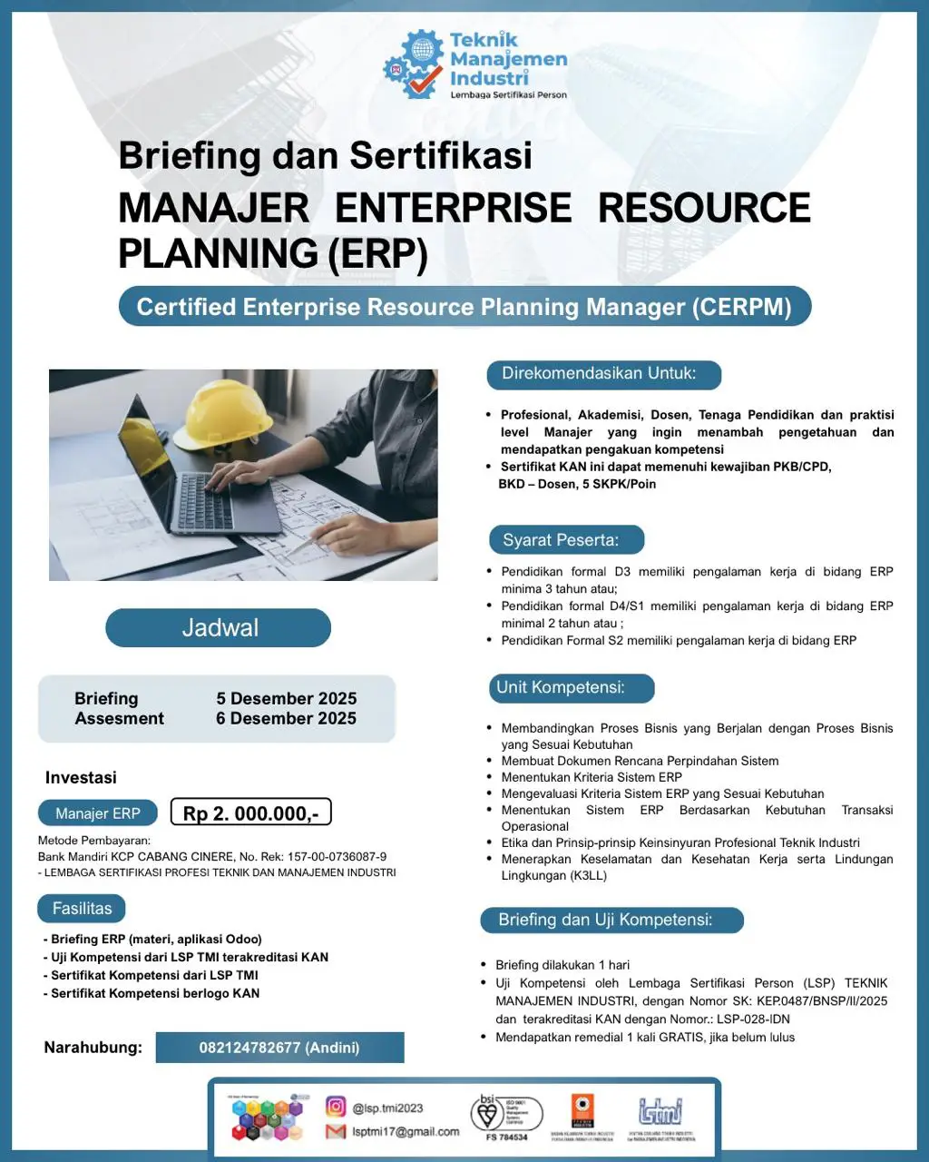 Tingkatkan kompetensi dan karier Anda dengan sertifikasi Certified Enterprise Resource Planning Manager (CERPM) dari LSP Teknik dan Manajemen Industri (terakreditasi KAN).