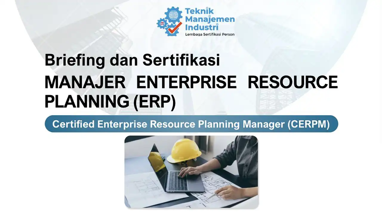 Briefing dan Sertifikasi MANAJER ENTERPRISE RESOURCE PLANNING (ERP) • Waktu dan Tempat Pelatihan: Senin - Jumat, 20-24 Oktober 2025. Hotel Sofyan Tebet Jakarta selatan • Waktu dan Tempat Ujian Sertifikasi: Sabtu - Minggu, 25-26 oktober 2025. Hotel Sofyan Tebet Jakarta selatan • Unit Kompetensi: 1. Membandingkan Proses Bisnis yang Berjalan dengan Proses Bisnis yang Sesuai Kebutuhan 2. Membuat Dokumen Rencana Perpindahan Sistem 3. Menentukan Kriteria Sistem ERP 4. Mengevaluasi Kriteria Sistem ERP yang Sesuai Kebutuhan 5. Menentukan Sistem ERP Berdasarkan Kebutuhan Transaksi Operasional 6. Menerapkan Keselamatan dan Kesehatan Kerja serta Lindungan Lingkungan (K3LL) 7. Etika dan Prinsip-prinsip Keinsinyuran Profesional
