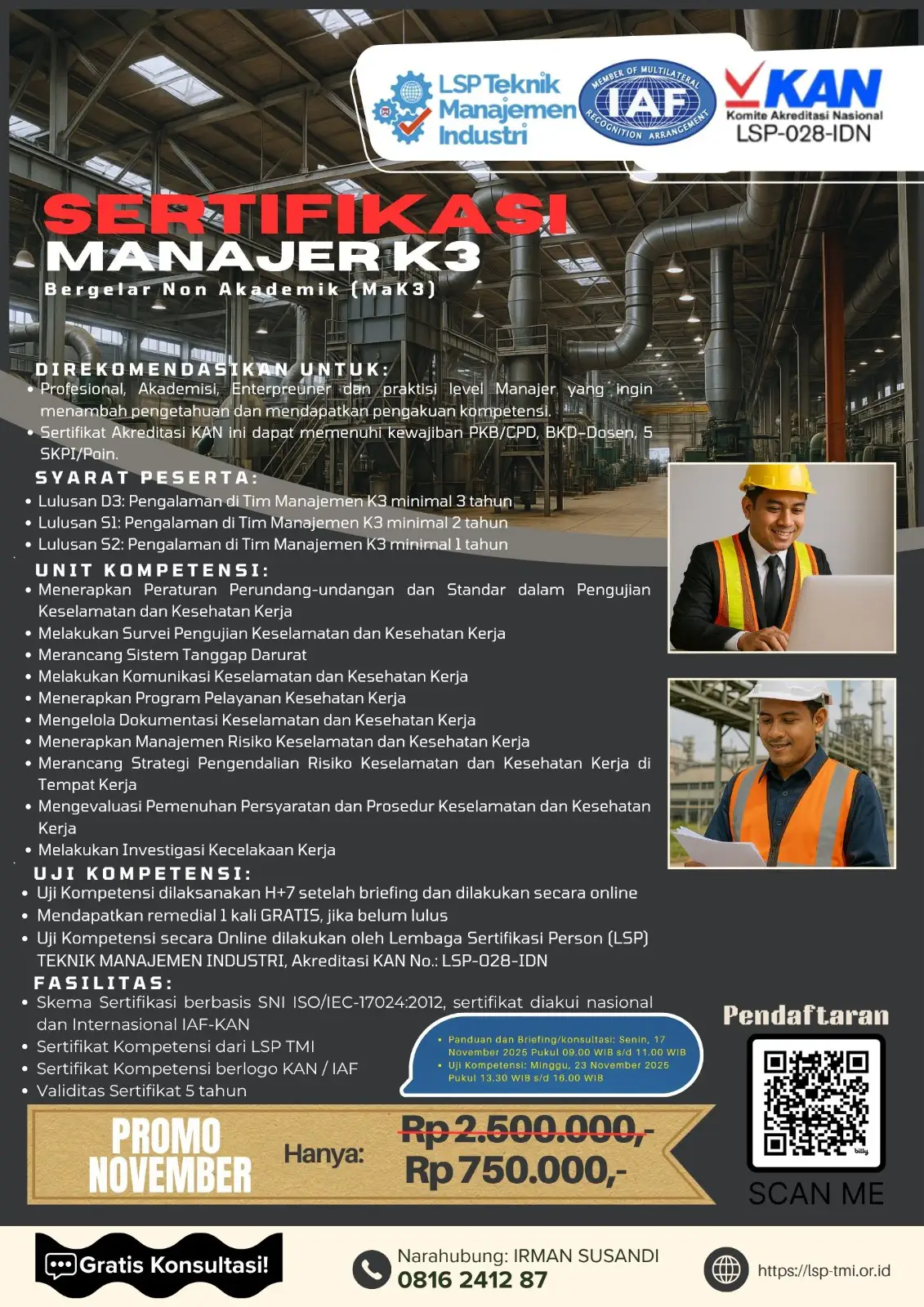 š” Saatnya upgrade diri lewat Sertifikasi Manajer K3 dari LSP Teknik Manajemen Industri ā lembaga terakreditasi KAN dan diakui secara nasional maupun internasional (IAF).