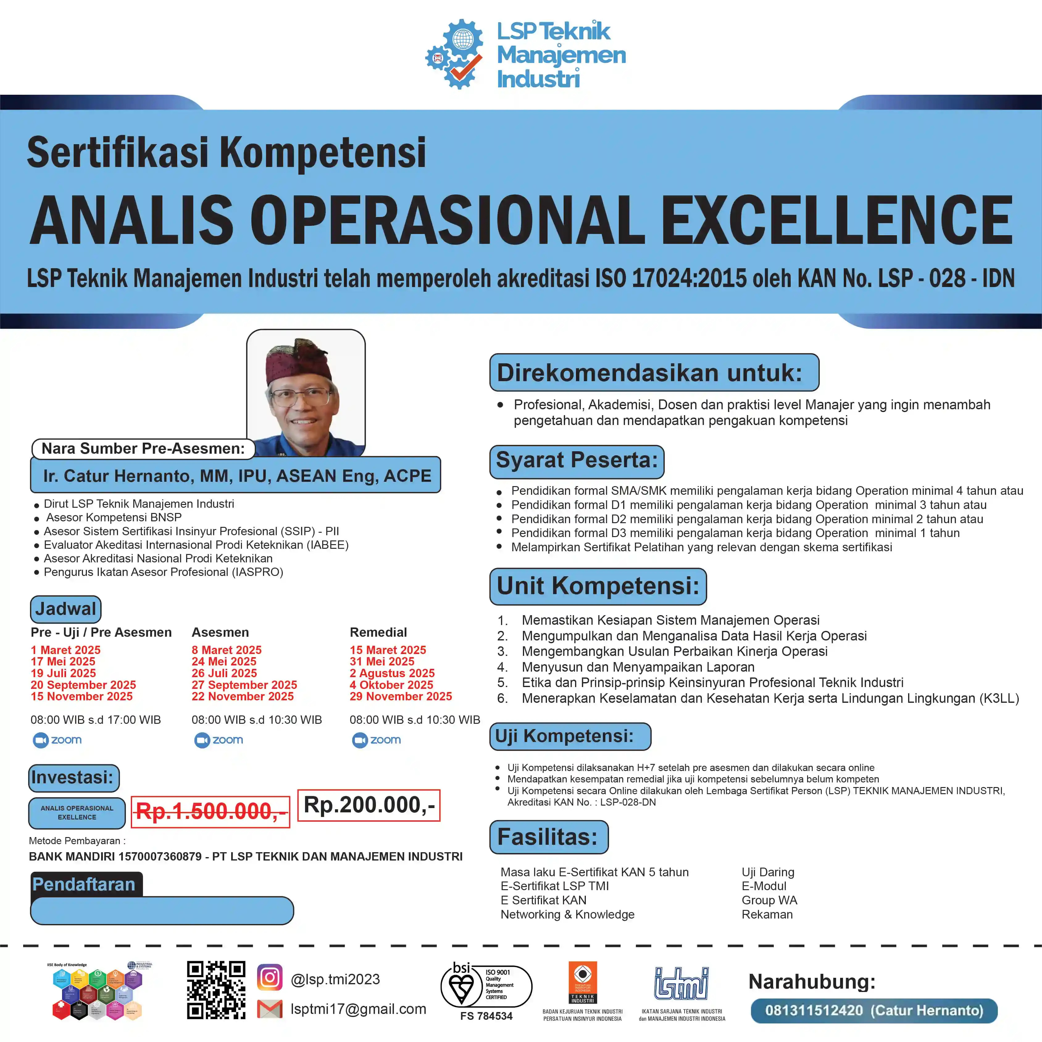 MEMUTUSKAN : SKEMA SERTIFIKASI ANALIS OPERATIONAL EXCELLENCE Berdasarkan acuan SNI ISO/IEC 17024:2012, Penilaian kesesuaian — Persyaratan umum untuk lembaga sertifikasi person sebagaimana terlampir. Surat Keputusan ini mulai berlaku sejak tanggal ditetapkan, dan dapat diubah atau diperbaiki di kemudian hari apabila dianggap perlu. Ditetapkan di : Jakarta PT Lembaga Sertifikasi Profesi Teknik Manajemen Industri |