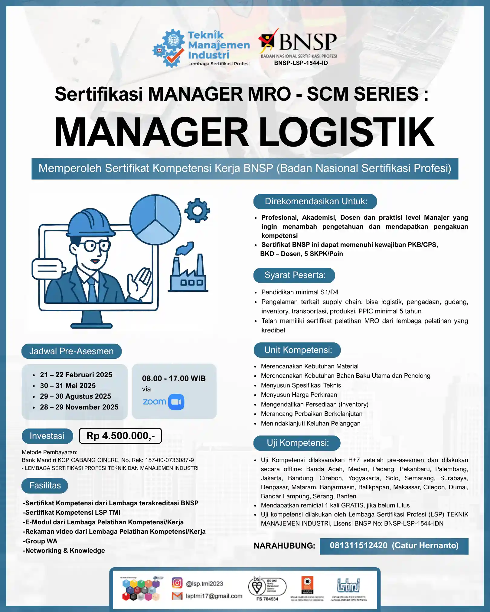 Skema Sertifikasi Okupasi Manajer Logistik MRO merupakan skema sertifikasi okupasi industri yang dikembangkan oleh LSP Teknik Manajemen Industri (LSP TMI) untuk industri Maintenance, Repair & Overhaul/Operations (MRO) yang melakukan pengoperasian dan perawatan aset atau mesin produksi yang vital dan strategis seperti industri penerbangan, perkapalan, pertambangan, perminyakan, kereta api, pabrik dan lainnya. Program ini dibutuhkan oleh: