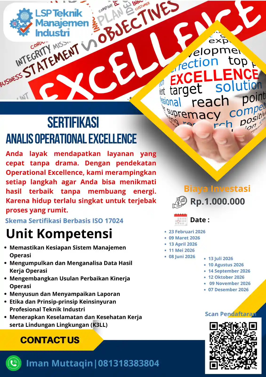 MEMUTUSKAN : MENETAPKAN : SKEMA SERTIFIKASI OPERATIONAL EXCELLENCE ANALYST Berdasarkan acuan SNI ISO/IEC 17024:2012, Penilaian kesesuaian — Persyaratan umum untuk lembaga sertifikasi person sebagaimana terlampir. Surat Keputusan ini mulai berlaku sejak tanggal ditetapkan, dan dapat diubah atau diperbaiki di kemudian hari apabila dianggap perlu. Ditetapkan di : Jakarta Pada tanggal : 30 Desember 2024 PT Lembaga Sertifikasi Profesi Teknik Manajemen Industri |