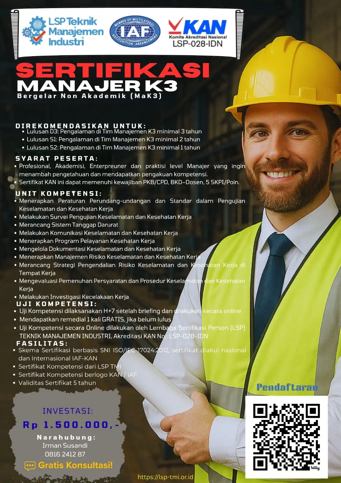 | Skema sertifikasi Manajer Keselamatan dan Kesehatan Kerja ini dikembangkan oleh Komite Skema Lembaga Sertifikasi Profesi Teknik Manajemen Industri (LSP TMI) untuk memenuhi kebutuhan sertifikasi kompetensi kerja di dunia usaha dan dunia industri.
