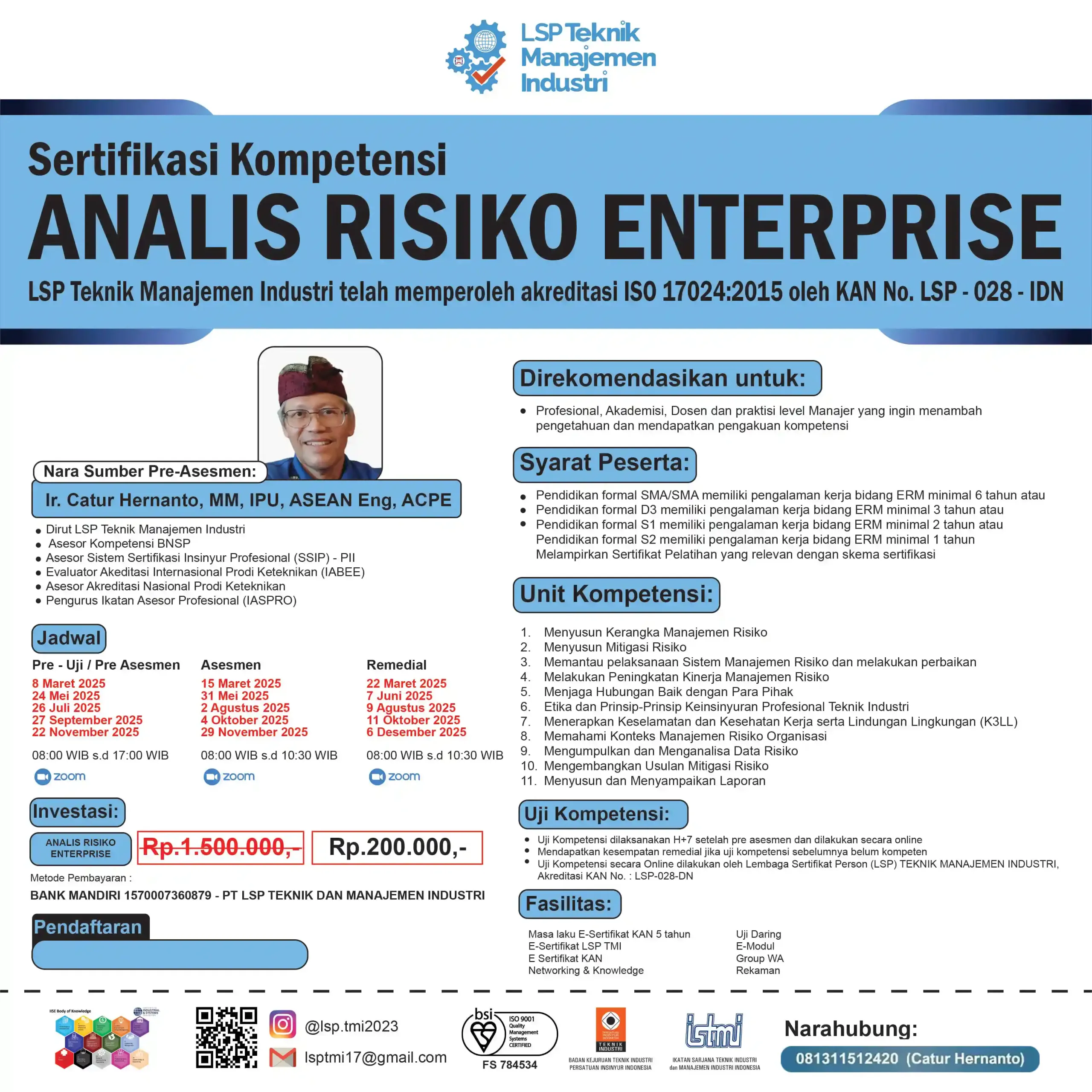 MEMUTUSKAN : SKEMA SERTIFIKASI ANALIS RISIKO ENTERPRISE Berdasarkan acuan SNI ISO/IEC 17024:2012, Penilaian kesesuaian — Persyaratan umum untuk lembaga sertifikasi person sebagaimana terlampir. Surat Keputusan ini mulai berlaku sejak tanggal ditetapkan, dan dapat diubah atau diperbaiki di kemudian hari apabila dianggap perlu. Ditetapkan di : Jakarta PT Lembaga Sertifikasi Profesi Teknik Manajemen Industri |