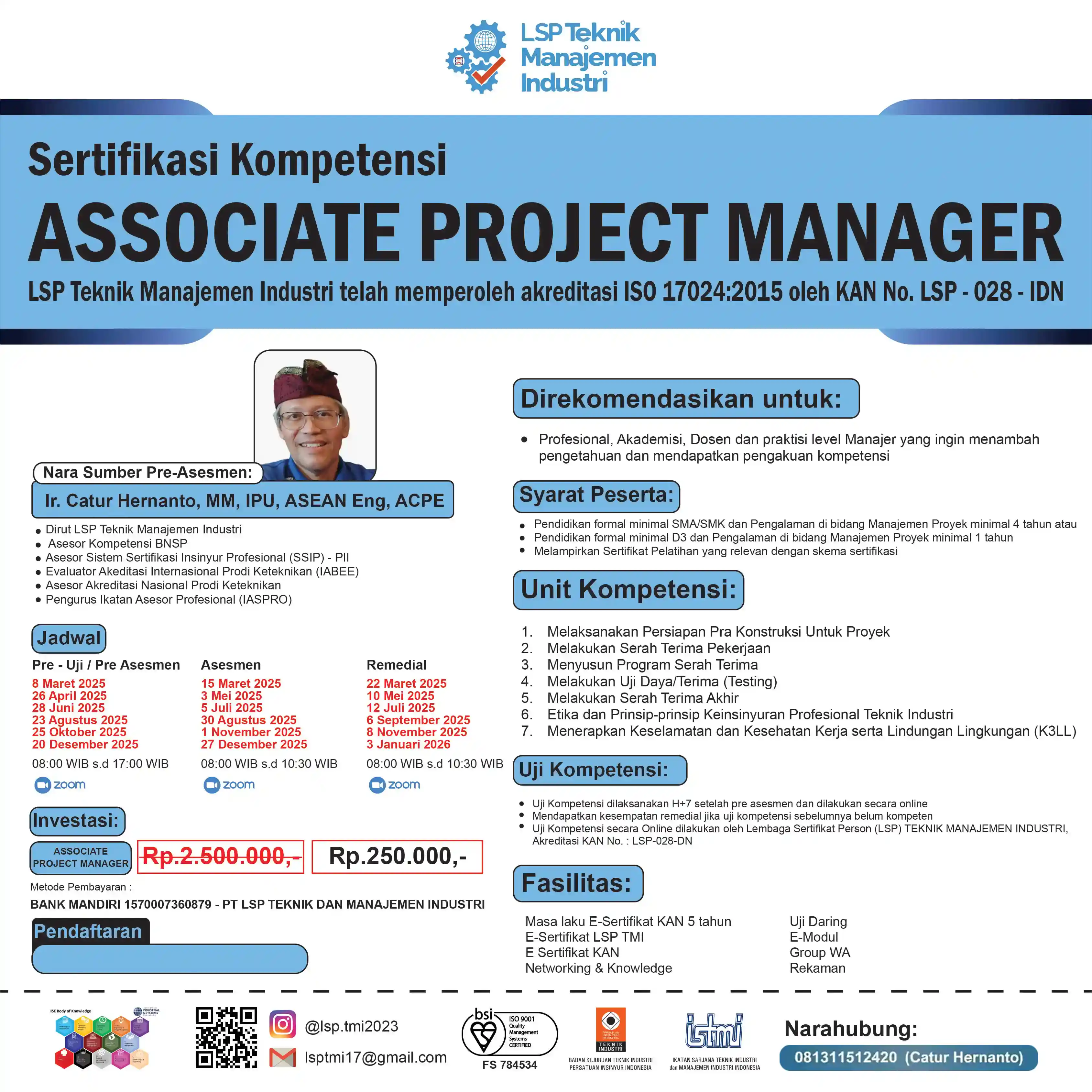MEMUTUSKAN : SKEMA SERTIFIKASI ASSOCIATE PROJECT MANAGER Berdasarkan acuan SNI ISO/IEC 17024:2012, Penilaian kesesuaian — Persyaratan umum untuk lembaga sertifikasi person sebagaimana terlampir. Surat Keputusan ini mulai berlaku sejak tanggal ditetapkan, dan dapat diubah atau diperbaiki di kemudian hari apabila dianggap perlu. Ditetapkan di : Jakarta PT Lembaga Sertifikasi Profesi Teknik Manajemen Industri |