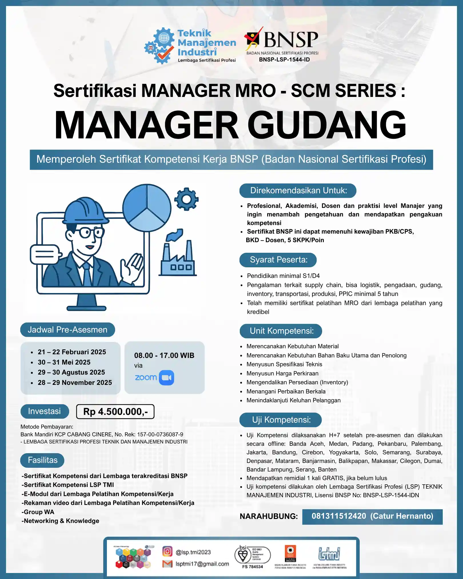 Skema Sertifikasi Okupasi Manager Gudang MRO merupakan skema sertifikasi okupasi industri yang dikembangkan oleh LSP Teknik Manajemen Industri (LSP TMI) untuk industri Maintenance, Repair & Overhaul/Operations (MRO) yang melakukan pengoperasian dan perawatan aset atau mesin produksi yang vital dan strategis seperti industri penerbangan, perkapalan, pertambangan, perminyakan, kereta api, pabrik dan lainnya. Program ini dibutuhkan oleh: