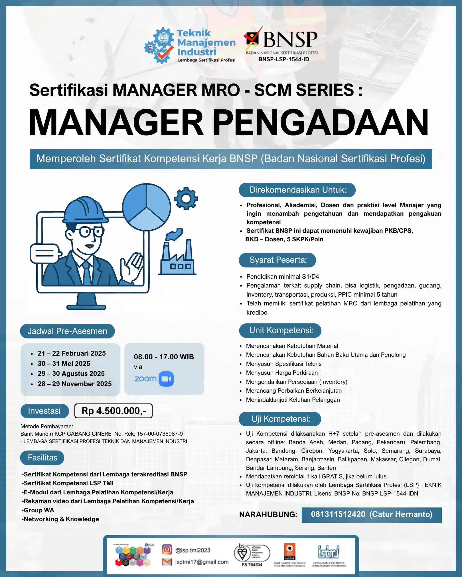 Skema Sertifikasi Okupasi Manajer Pengadaan MRO merupakan skema sertifikasi okupasi industri yang dikembangkan oleh LSP Teknik Manajemen Industri (LSP TMI) untuk industri Maintenance, Repair & Overhaul/Operations (MRO) yang melakukan pengoperasian dan perawatan aset atau mesin produksi yang vital dan strategis seperti industri penerbangan, perkapalan, pertambangan, perminyakan, kereta api, pabrik dan lainnya. Program ini dibutuhkan oleh: